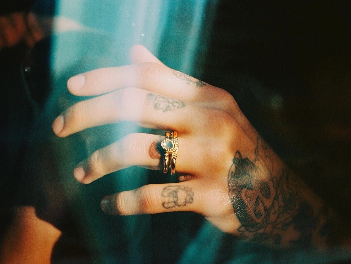 A hand is seen with 2 rings on the fingers & subtle tattoos in the late night through a reflection in a glass window. Kodak Gold 200