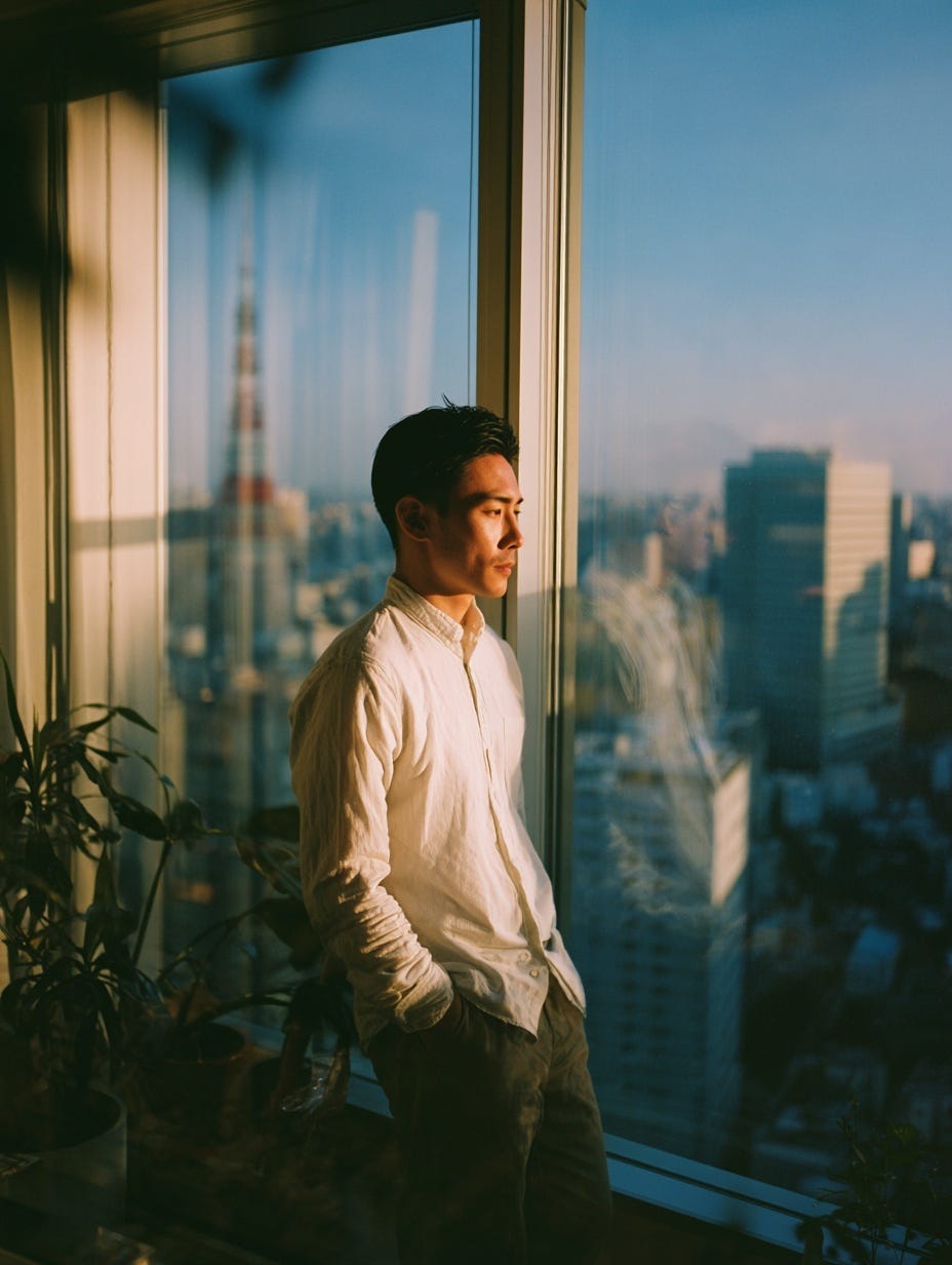 “A portrait of man in a white shirt, standing by floor-to-ceiling windows in a Tokyo apartment in the morning, shot on Kodak Portra 200”