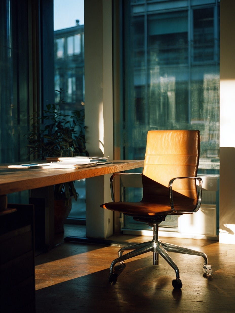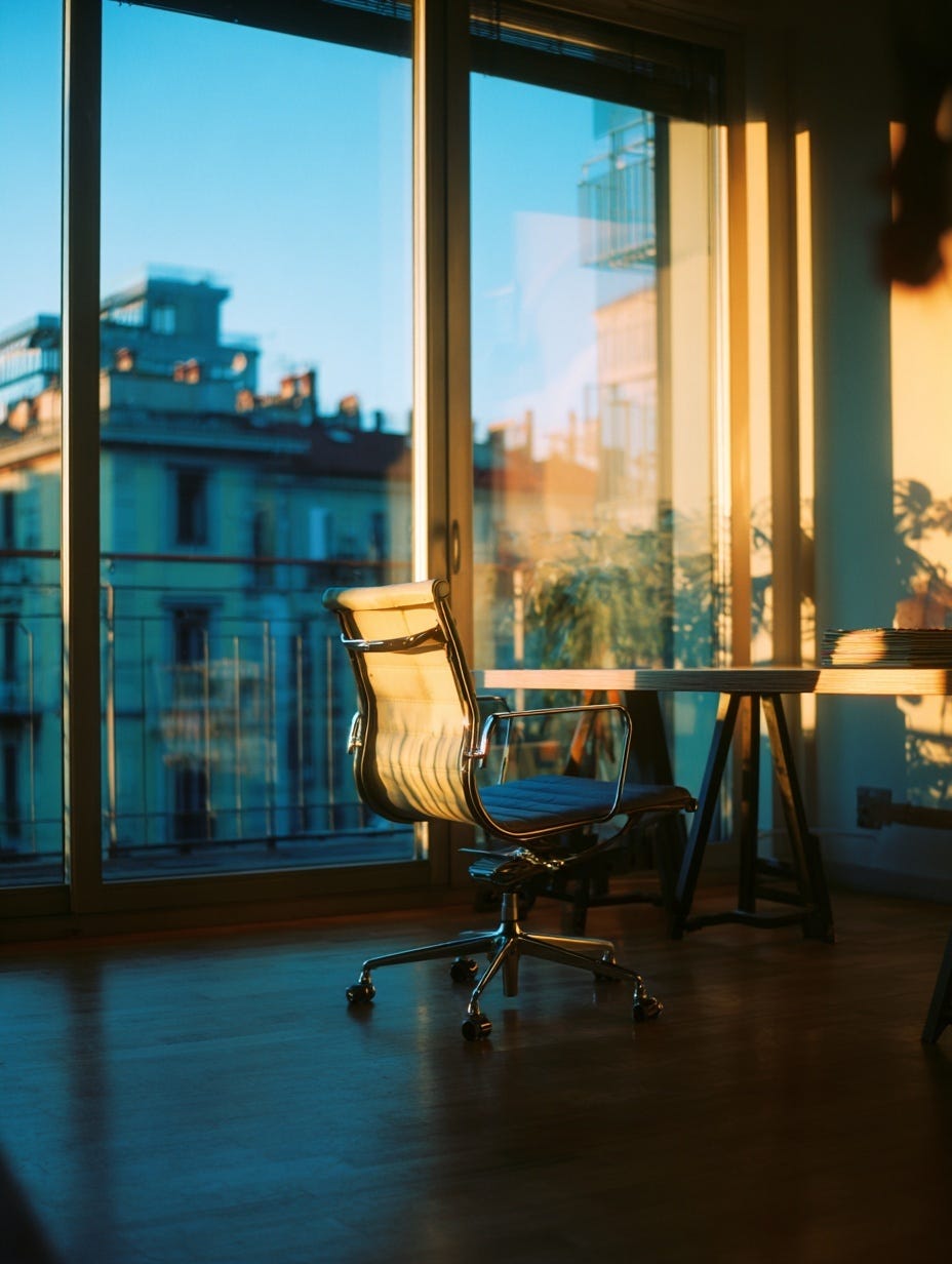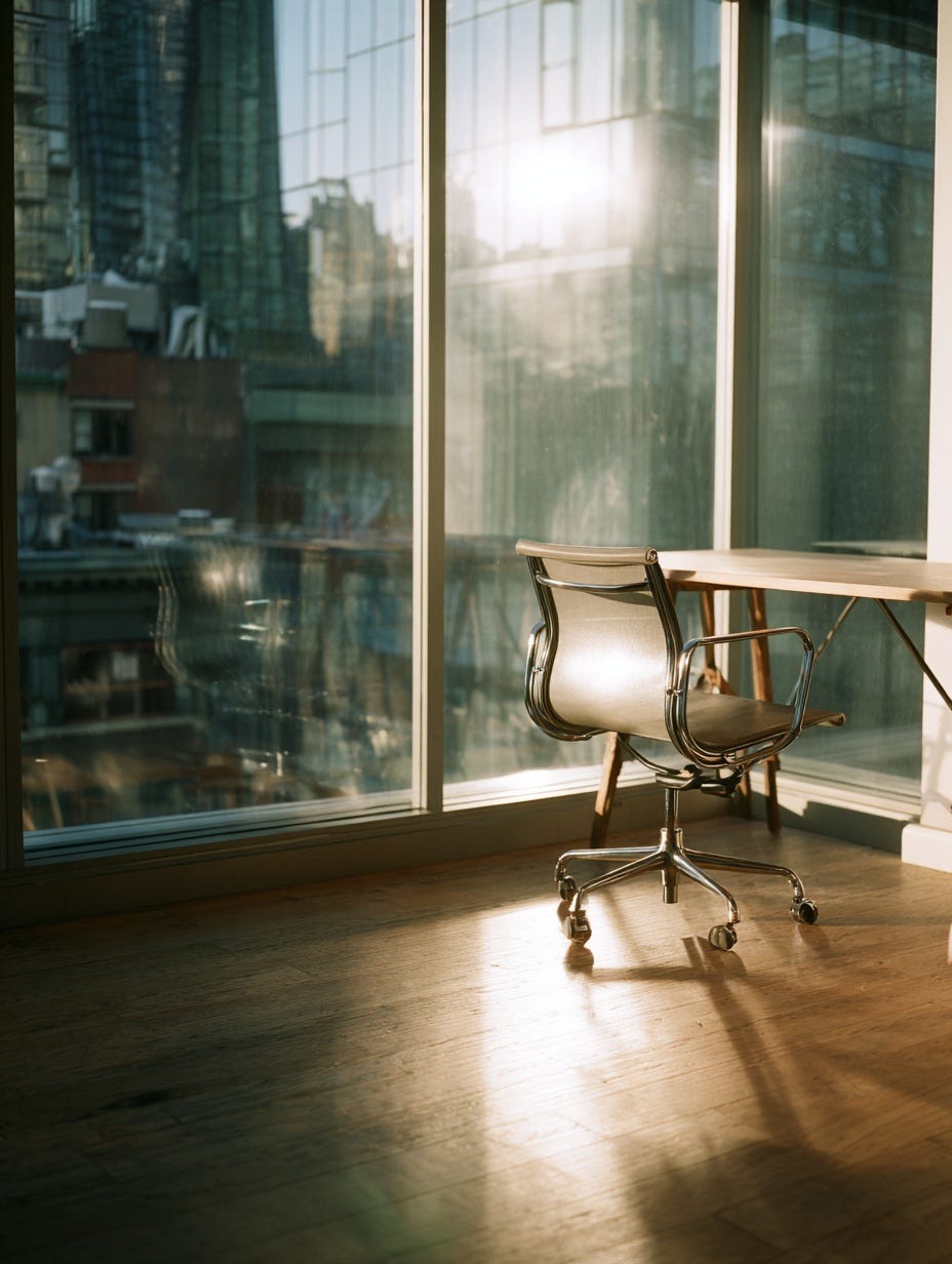 "An empty stylish office chair behind a trestle desk in the early morning light in a modern glass Italian architect’s office in Milan, FujiColor C200"
