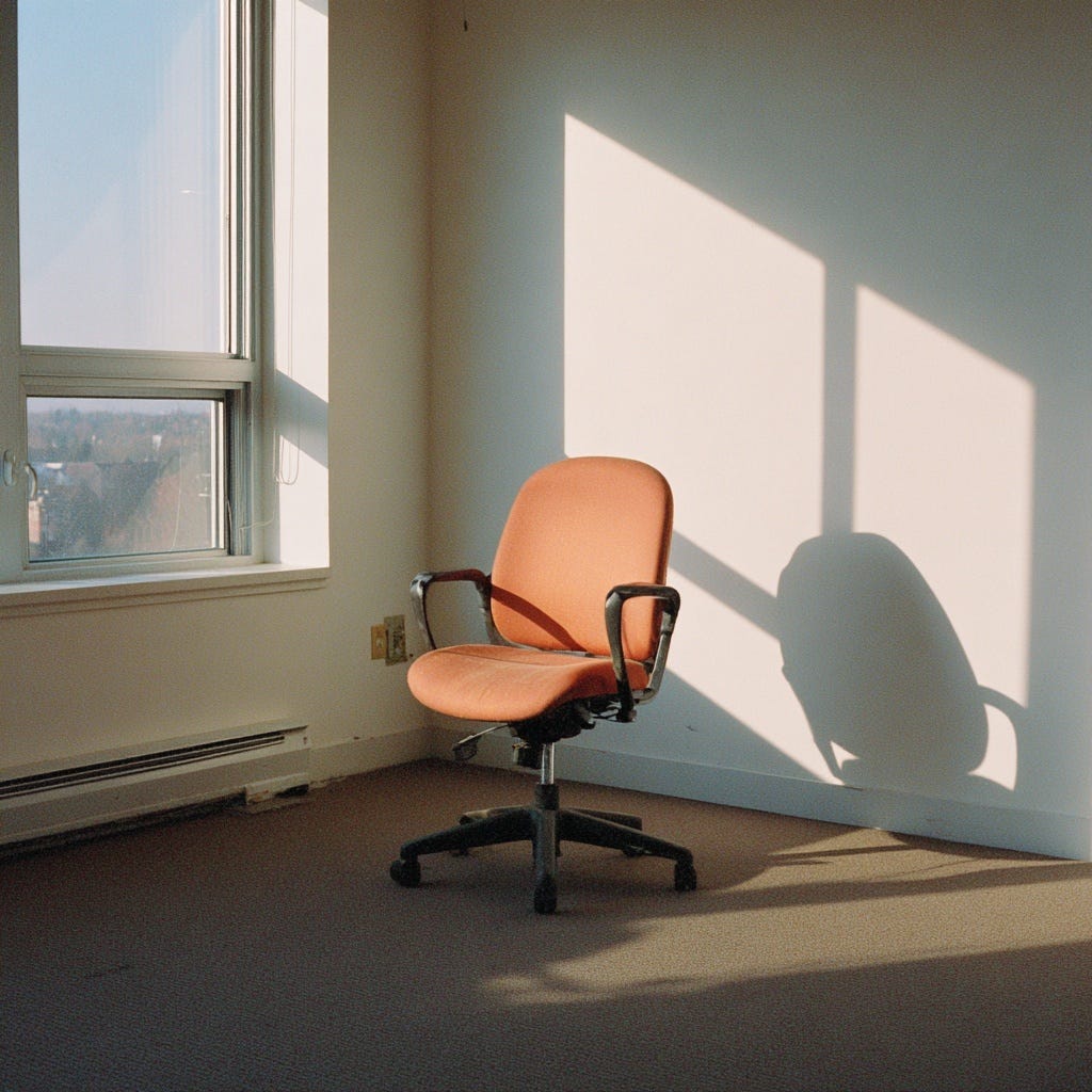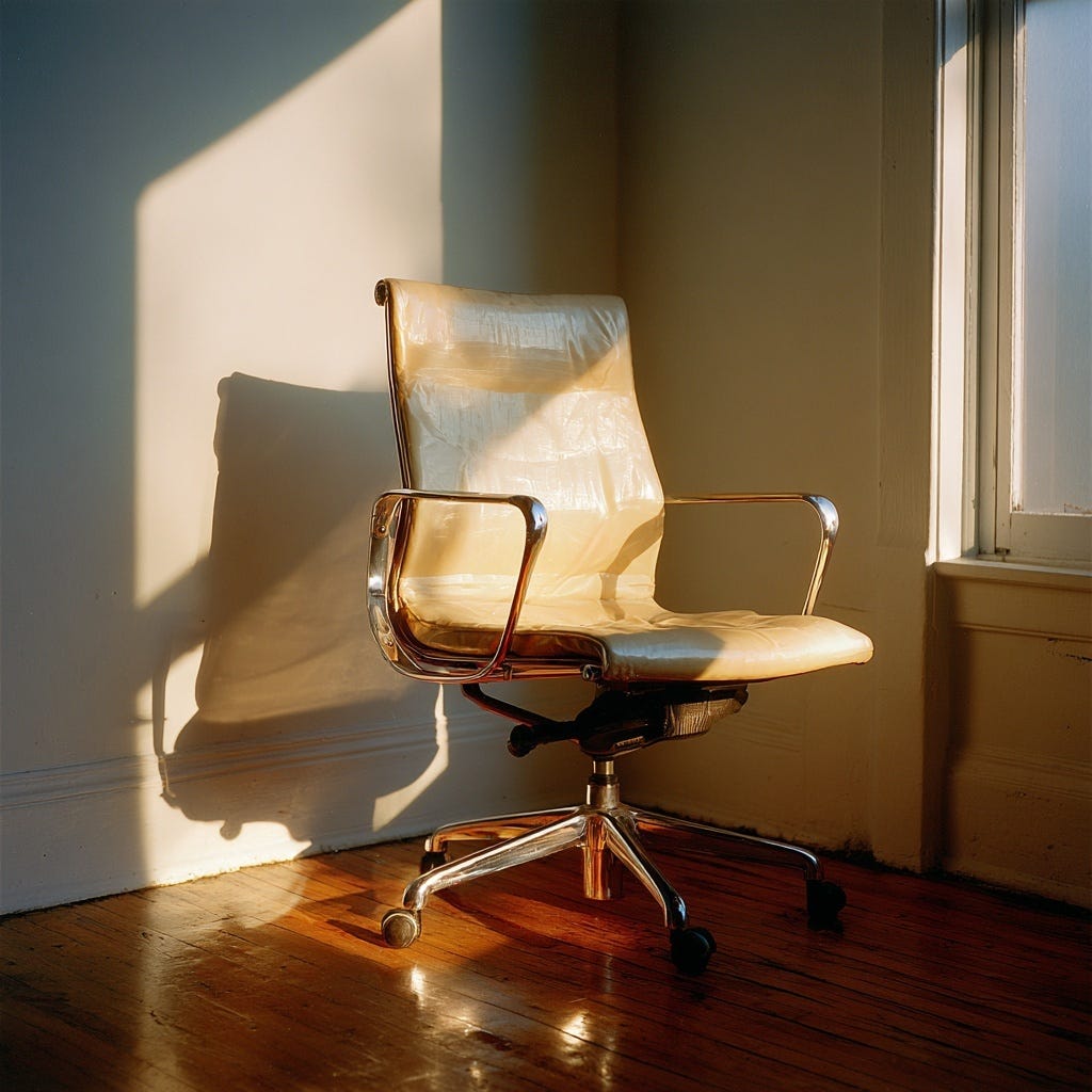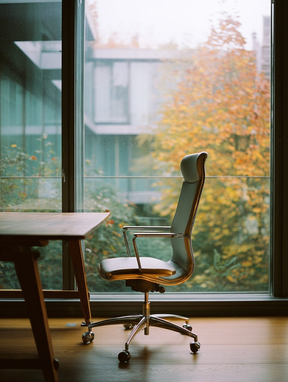 "An empty stylish office chair behind a trestle desk in the early morning light in a modern glass Italian architect’s office in Milan, FujiColor C200"