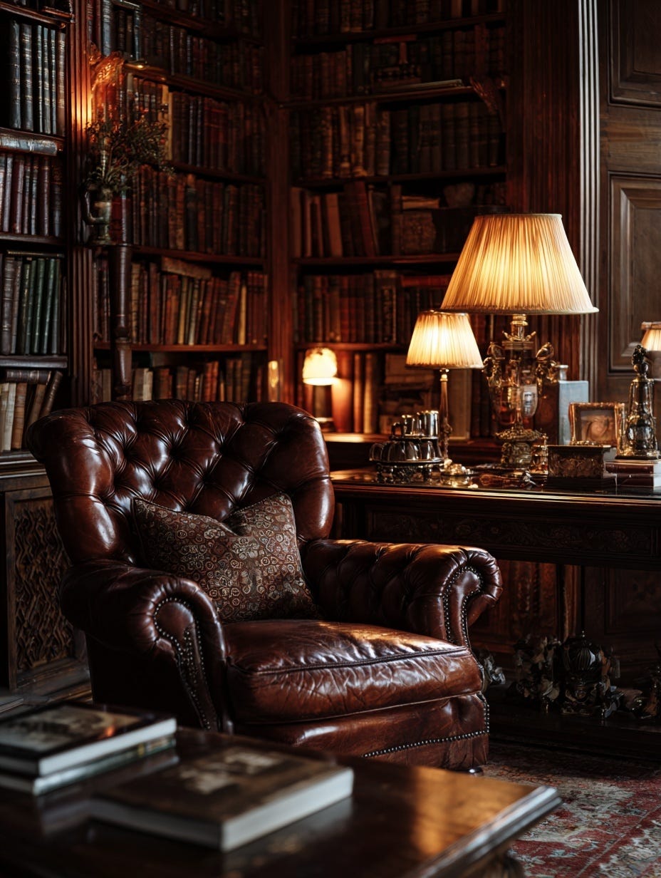 “An empty leather armchair faces floor-to-ceiling bookshelves in a private library illuminated by warm table lamps, traditional English manor, Victorian elegance, Fujifilm Pro 400H”