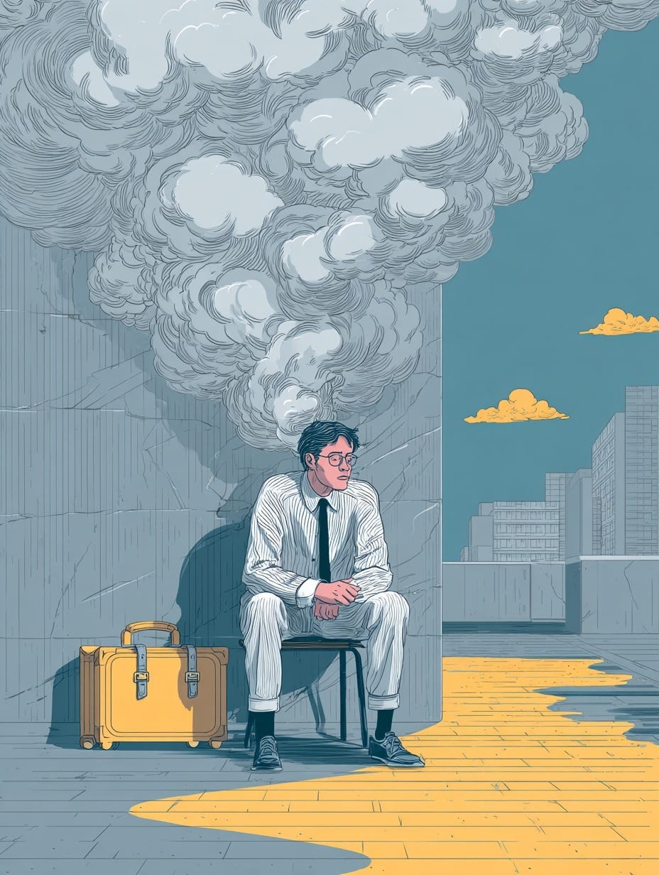 You could try that as a prompt but it will give you illustrations of heads on fire or smoking desks. The key is adding a film style, it narrows it down and although you'll likely get back some pretty bland options like people asleep at their desks—these can then be developed into more refined prompts.