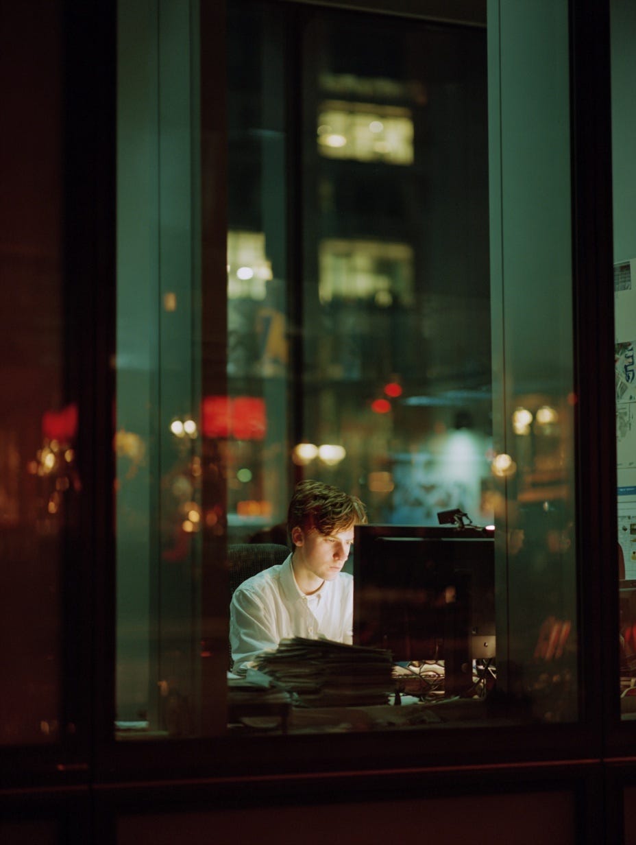 “Young person looking blankly at a screen in an office in downtown Madrid late at night. Kodak Portra”