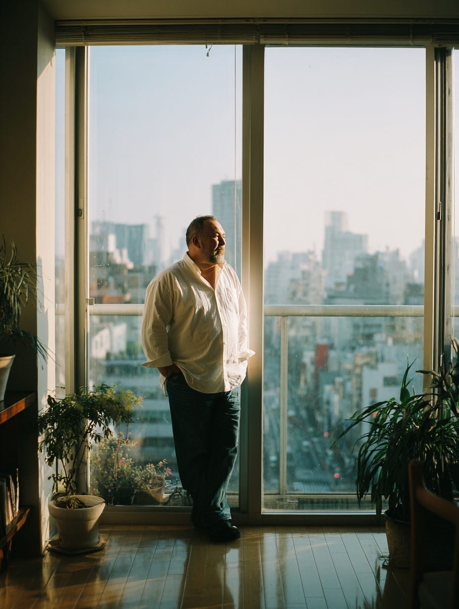 “A portrait of a stocky man in a white shirt, standing by floor-to-ceiling windows in a Tokyo apartment in the morning, shot on Kodak Portra 200”