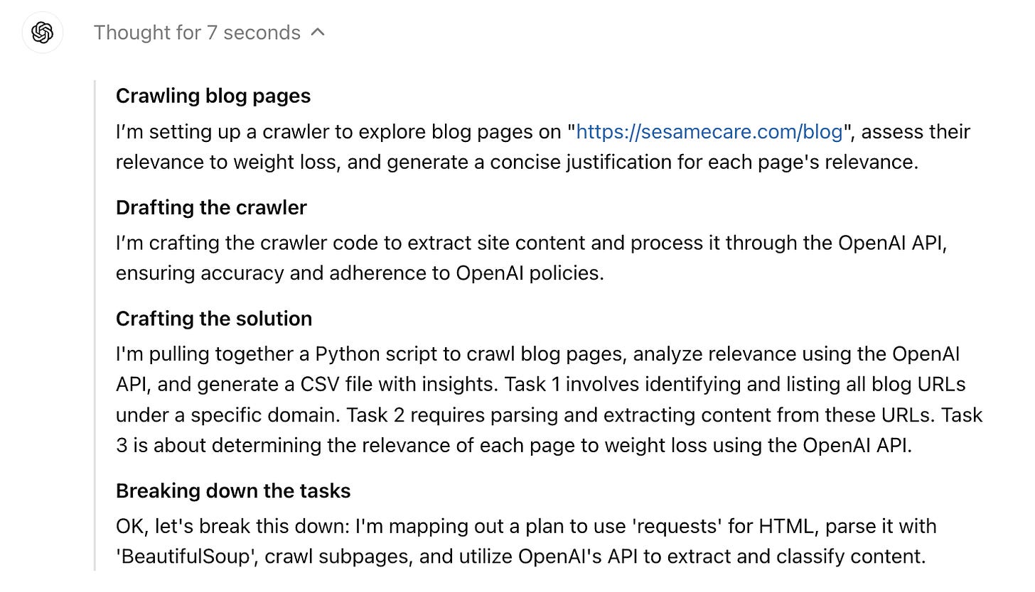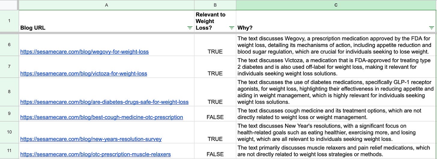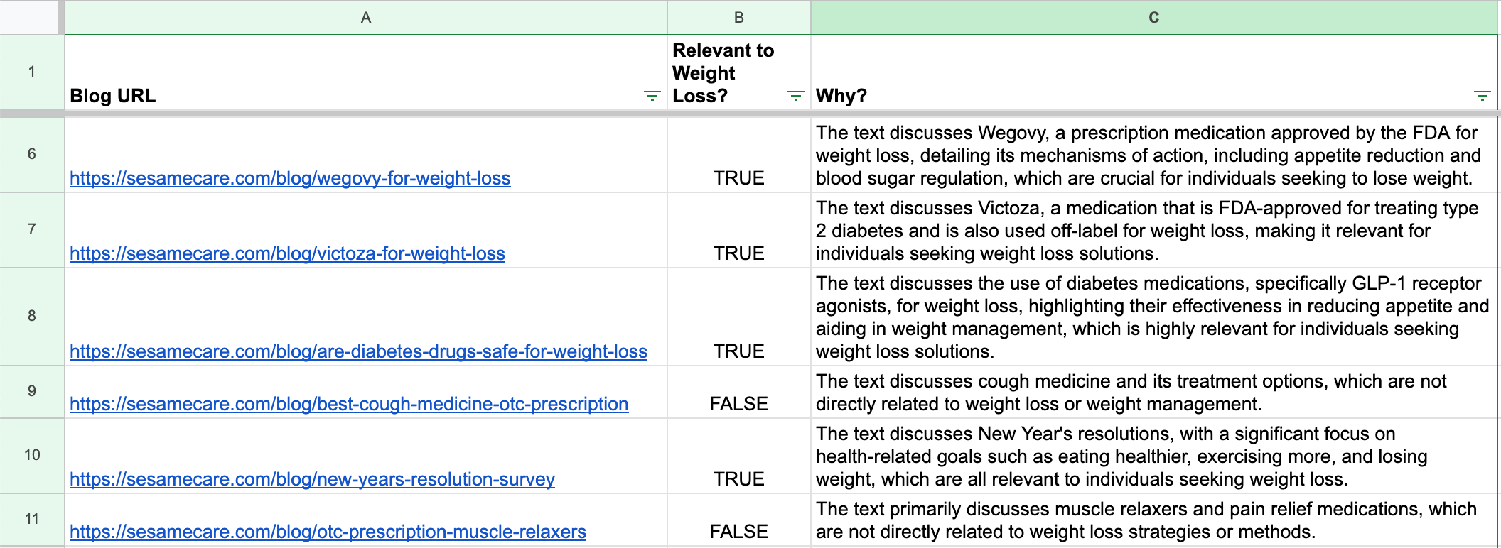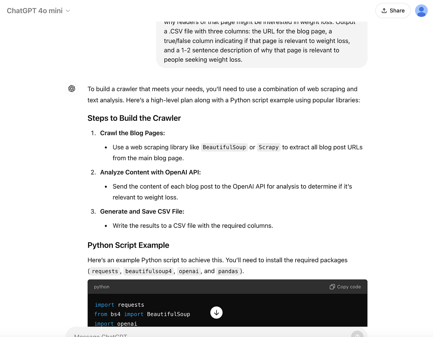 Crazy idea… we can write a script to crawl through all of the blog pages and have OpenAI determine if the page is relevant to weight loss. In a few hours of coding, we’d accomplish what would have taken days of manual work.